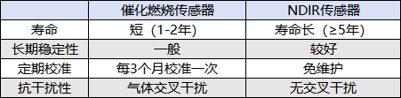 催化燃烧检测是气体接触催化剂后引发无焰燃烧,燃烧加热测温丝,顺利获得检测测温丝的电阻值变化,计算气体浓度,原理决定了其寿命短、长期稳定性差等问题。