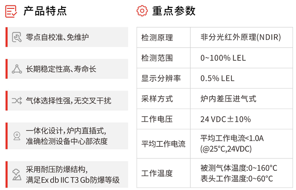 欧博ABG环保自主研发NMP气体泄漏监测报警器Gasboard-2063基于NDIR原理,满足Ex dbIIC T3 Gb防爆等级,具有工业 4-20mA 电流输出、RS485 对外通讯及浓度超限报警输出功能,适用于复杂苛刻的高温工业环境。